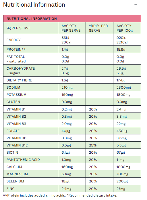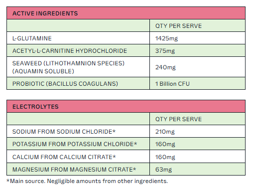 Soluble Maize Fibre, Mineral Salts (Calcium Citrate, Sodium Chloride, Magnesium Citrate, Potassium Chloride), Natural Flavour, L-Glutamine, Acidity Regulator (Citric Acid), Anti-Caking Agent (Silicon Dioxide), Acetyl-L-Carnitine Hydrochloride, Seaweed (Lithothamnion species), Sweetener (Sucralose), Minerals (Zinc Gluconate, Sodium Selenite) Colour (Allure Red), Probiotic (Bacillus coagulans), Vitamin B Complex (B3 (Niacin), B5 (Pantothenic Acid), B6 (Pyridoxine Hydrochloride), B2 (Riboflavin), B1 (Thiamin Hydrochloride), B9 (Folic Acid), B7 (D-Biotin), B12 (Cyanocobalamin)).
